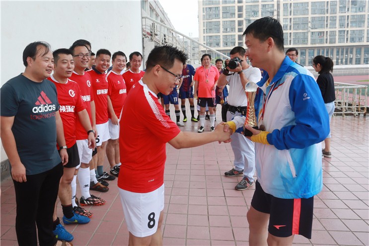 公司财务副总监、国祯环保足球队队长王祥宇为获奖队颁奖