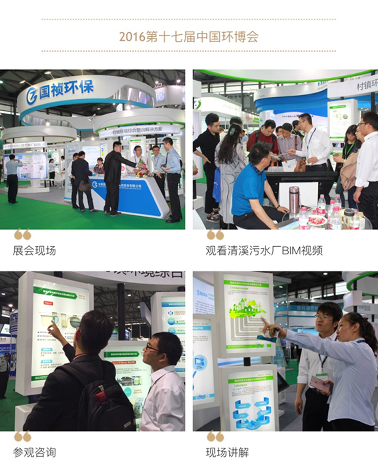 此次展会,国祯环保全方位地展示了公司业务领域和标志性事件,四大主题展区着重推介了公司的四种业务解决方案和相关案例,分别是类IV类水标准核心技术解决方案及案例、全地埋式污水处理厂PPP项目技术方案及案例、水环境综合治理解决方案及案例、村镇环境综合整治解决方案及案例等,吸引了大量参展观众和业内人士前来参观咨询,获得了高度关注和好评。其中,我司展出的村镇环境综合整治解决方案和黑臭水体治理解决方案是参展观众的咨询热点,我司各事业部负责人从专业角度与观众进行深度交流、沟通、洽谈。现场还吸引了海外人士和媒体的关注,与国际友人进行了业务交流沟通,中国环保在线高端访谈对我司进行了现场采访和报道。