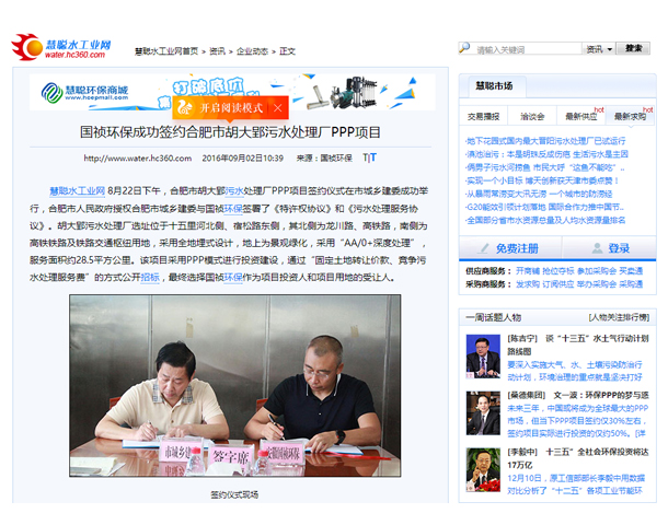 合肥日报 中国水网 凤凰网等媒体竞相报道国祯环保成功签约胡大郢污水处理厂PPP项目