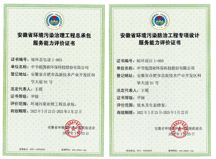 3月23日,经过前期材料准备、专家评审及实地考察,中节能国祯获得安徽省环境保护产业发展促进会颁发的《安徽省环境污染治理工程总承包服务能力评价证书(环境污染治理工程总承包甲级)》、《安徽省环境污染防治工程专项设计服务能力评价证书(废水及生态修复甲级)》两项证书。