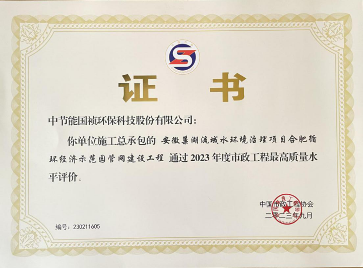 本次中国市政工程最高质量水平评价的获得,不仅是对获奖工程项目质量的认可,同时也对中节能国祯在工程质量管理具有重要意义,并为公司在品牌宣传和市场开拓方面做出了卓越贡献。